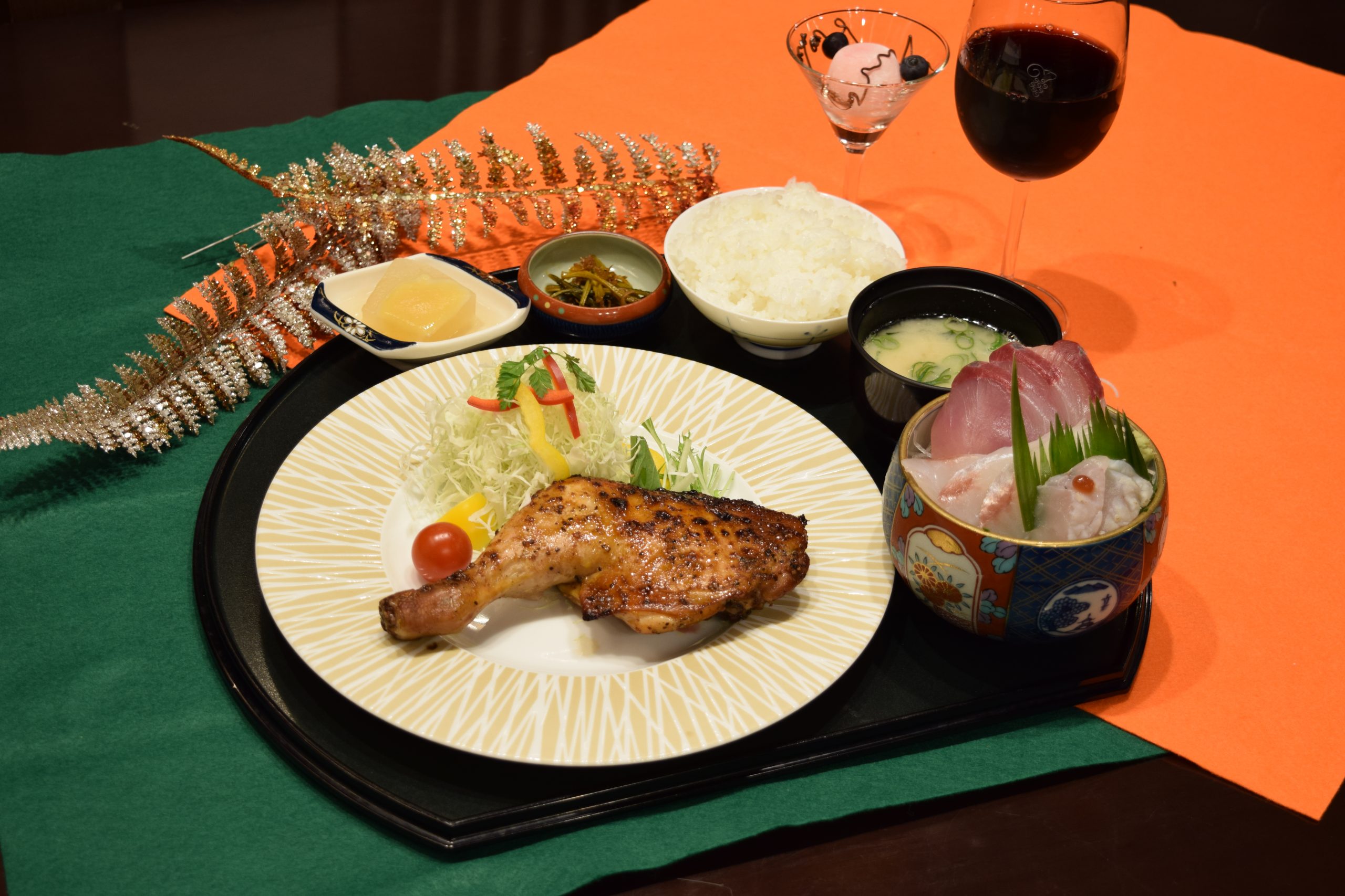 クリスマスにちなんで国産の鶏のもも(骨付き)を秘伝のタレで焼いた山賊焼と地魚刺身とデザート付きの定食です。