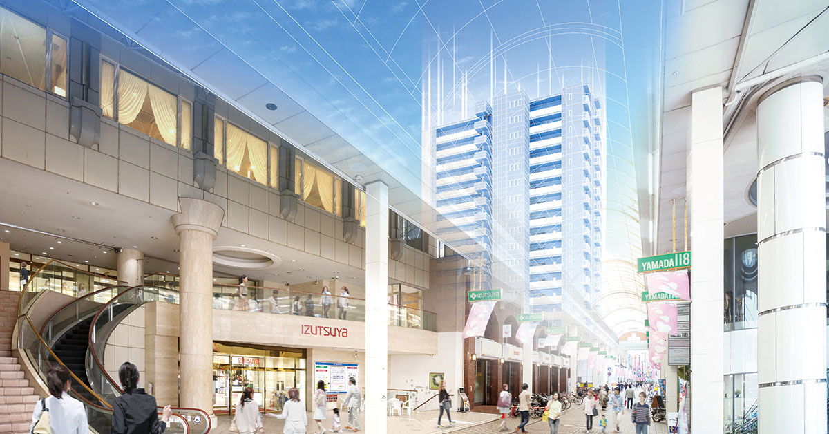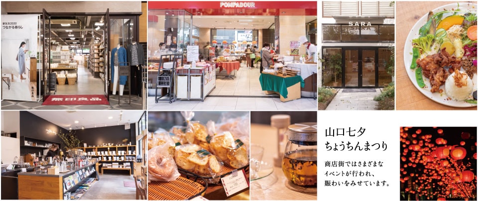 「グランドパレス米屋町プライムマークス」が直結する山口市中心商店街には、百貨店をはじめ、日用品や生鮮食品などの専門店、お洒落なカフェや飲食店、