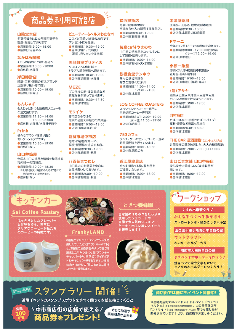 コメコメマルシェ』(主催:協同組合米屋町振興会)、山口井筒屋2階『コトサイト』(主催:株式会社街づくり山口)等でも催し物が開催されています!ぜひ、商店街でお楽しみください。
