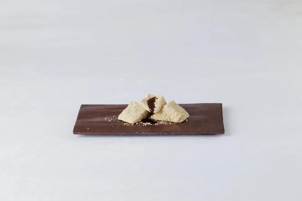 黒糖の濃厚なコクと香りが、わらび餅のもっちりとした食感と引き立て合う菓子です。お好みで香ばしく仕上げたきな粉をかけてお召し上がりください。
