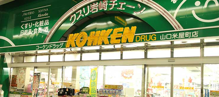グリーンの外壁にイエローの「KOHKEN」と書かれた大きな看板が目立つドラッグストアです。棚に並ぶお買い得商品や人気商品が目につきます。