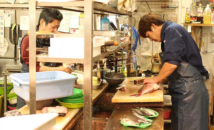 川端市場の入り口すぐ横にて店舗を構えている魚屋です。店頭では二代目と三代目が真剣なまなざしで魚を捌いています。