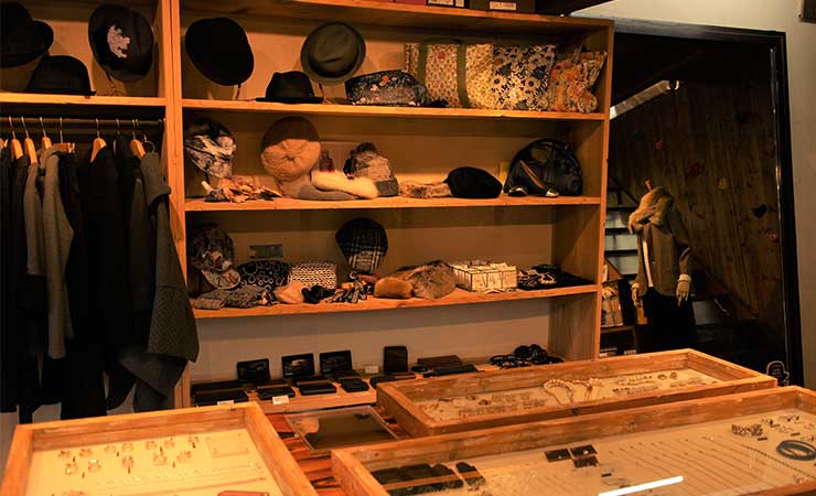 駅通り商店街に向かって進むと右手に見えてくる斜めのショーウィンドウ。店内には厳選されたトップス、ボトムス、ハットや小物が並びます。