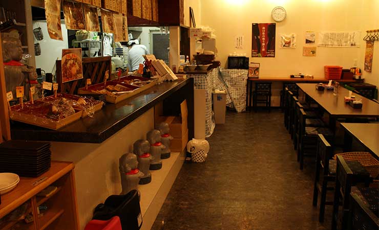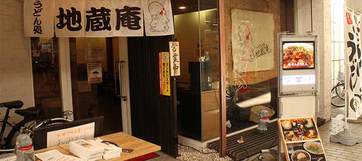 約10年間、山口市内のさぬきうどん店で店長として働かれていたご主人が、2013年6月1日に自身のお店をオープン。無添加のだしと自家製麺にこだわったできたての「さぬきうどん」を食べることができます。「地蔵庵」の“地蔵”はご主人のニックネームからで、その名のとおり優しそうな表情が印象的。店内にはご主人にそっくりな愛嬌のある地蔵様が置かれています。お店のシステムは気軽なセルフサービス式。入ってすぐあるカウンターには、約15種類の天ぷらやおむすびが並び、お好みのものを自分で選び会計に進みます。うどんは約20種類で、中でも全部の具が入ったボリューム満点の「地蔵庵スペシャル」(600円)がおすすめです。また、程よくこってり味の「牛めし」(250円)やチャーハンなどのご飯ものもあります。