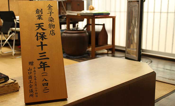 「染め付けから染め変え、洗い張り、家紋を付ける紋入れなど、着物のことなら何でもご相談ください」という老舗です。ご主人の繁さんで六代目となり、妻の周子さんと一緒に店を切り盛りされています。歴史が古いだけあり、「金子染物店」には様々な資料が眠っていて、店の過去帳には「文化9年生まれの弥兵衛が30歳の時に紺屋(染物屋)を始めた」とあるそうです。店内には「創業天保十三年」と書かれた立派な木の看板が飾ってあります。
